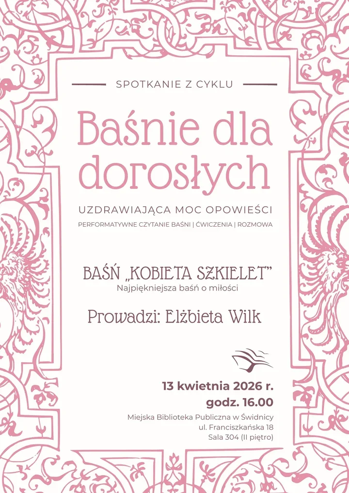 W Miejskiej Bibliotece Publicznej im. Cypriana Kamila Norwida w Świdnicy znów zrobi się trochę bardziej symbolicznie, trochę bardziej intymnie i zdecydowanie mniej zwyczajnie. Cykl „Baśnie dla dorosłych” wraca z propozycją dla tych, którzy lubią, gdy opowieść nie tylko prowadzi za rękę, ale też zostawia po sobie kilka pytań. 📚