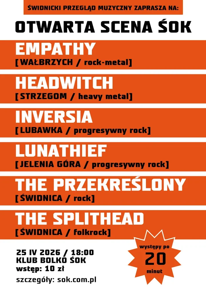 Kolejność występów zostanie ustalona dopiero w dniu wydarzenia, więc najlepiej pojawić się od początku i nie wpaść w środek muzycznej układanki. Start w sobotę 25 kwietnia o 18:00 w Klubie Bolko ŚOK, a wejściówki są dostępne w przedsprzedaży i na bramce po 10 zł. Cena biletu to 10 zł, pula jest ograniczona. 😉