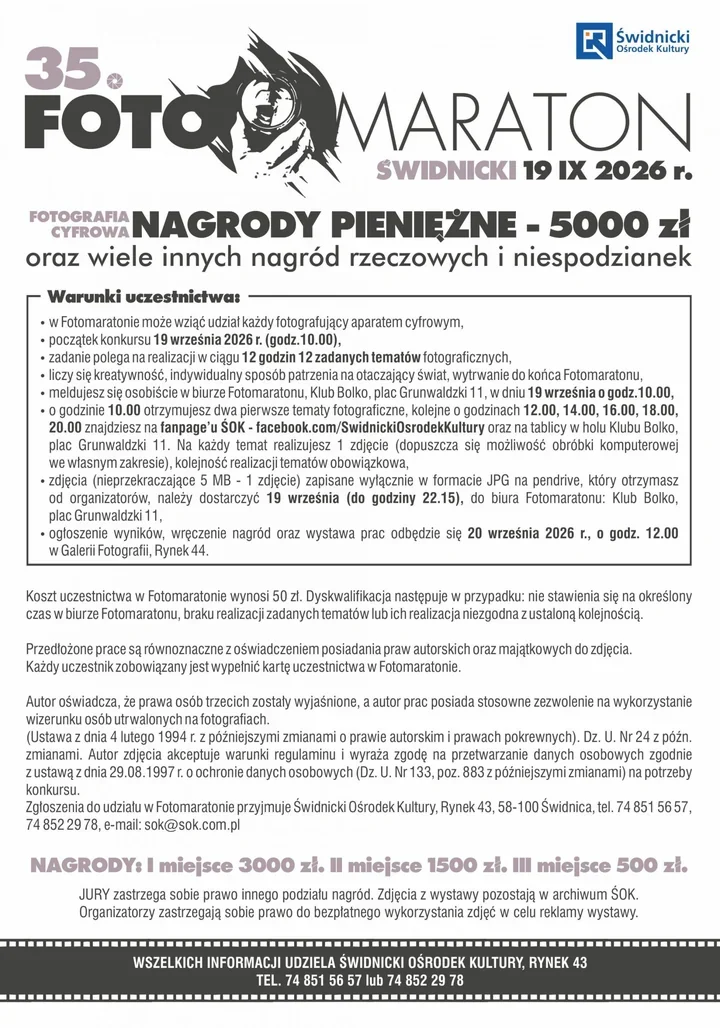- 19 września 2026 r., godz. 10:00 - start konkursu i meldunek w biurze Fotomaratonu